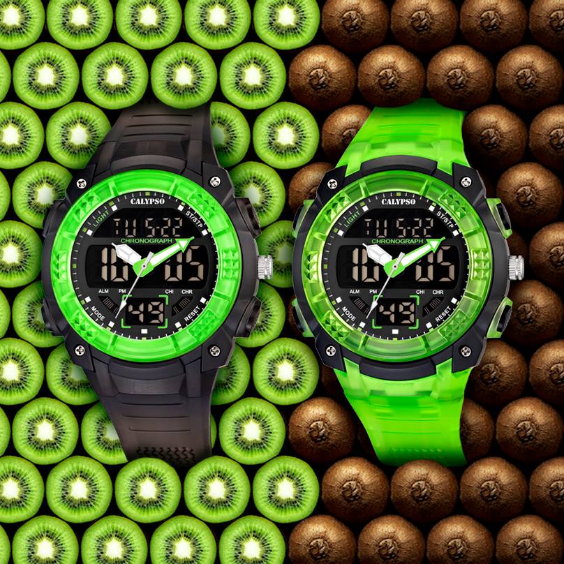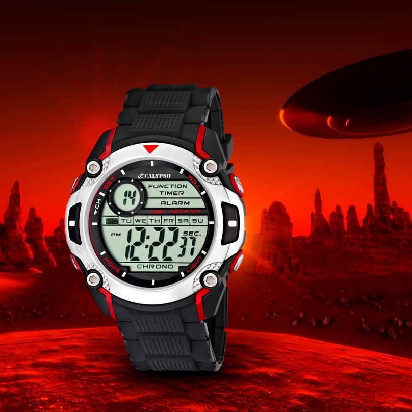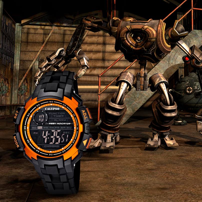 Calypso poco a poco esta mejorando la imagen de sus relojes digitales. El diseño en estos últimos tiempos se esta convirtiendo en una valor activo de la marca. Sus relojes digitales son sumergibles 50m (5 atm) o 100m ( 10 atm).